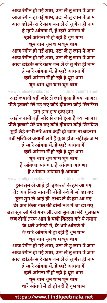 Lyrics of Aaj Rangin Ho Gayi Sham, Dhoom Dhaam - आज रंगीन हो गई शाम, धूम धाम