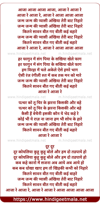Lyrics of Aaja Re Janm Janm Ki Pyasi Ankhiya - आजा रे जन्म जन्म की प्यासी अंखिया
