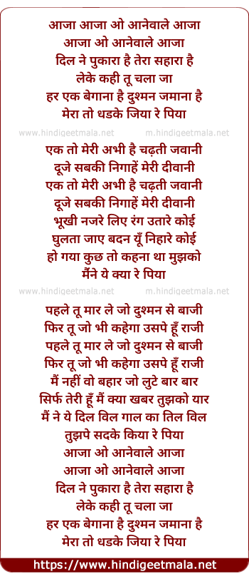 Lyrics of Aaja Aanewala Aaja - आजा आनेवाले आजा