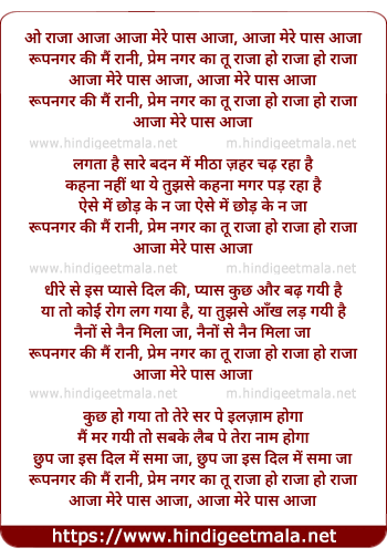 Lyrics of O Raaja Aaja Aaja Mere Paas Aaja - ओ राजा आजा आजा मेरे पास आजा