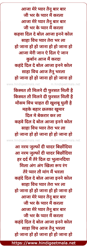 Lyrics of Aaja Mere Pyar Tainu Baar Baar - आजा मेरे प्यार तैनू बार बार