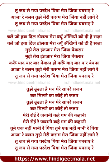 Lyrics of Aaja Re Balam Tujhe Meri Kasam Mera Jiya Nahi Lage Re - आजा रे बलम तुझे मेरी कसम मेरा जिया नहीं लागे रे