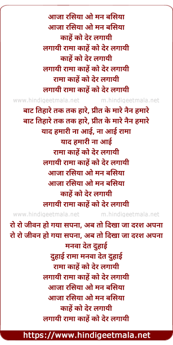 Lyrics of Aaja Rsiya O Man Basiya - आजा रसिया ओ मन बसिया