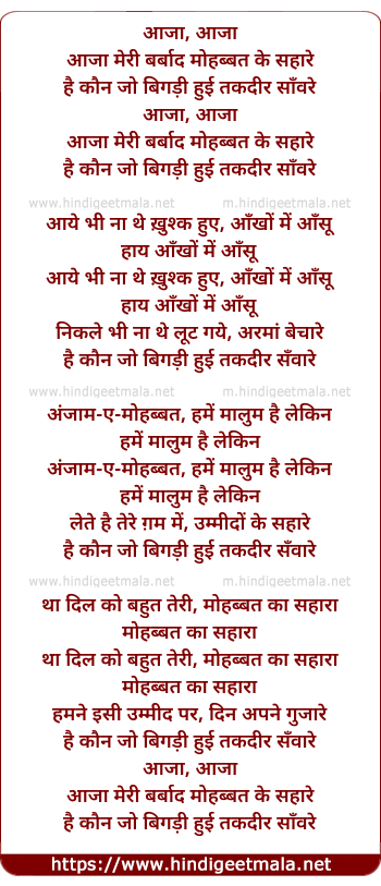 Lyrics of Aaja Meri Barbad Mohabbat Ke Sahare - आजा मेरी बर्बाद मोहब्बत के सहारे