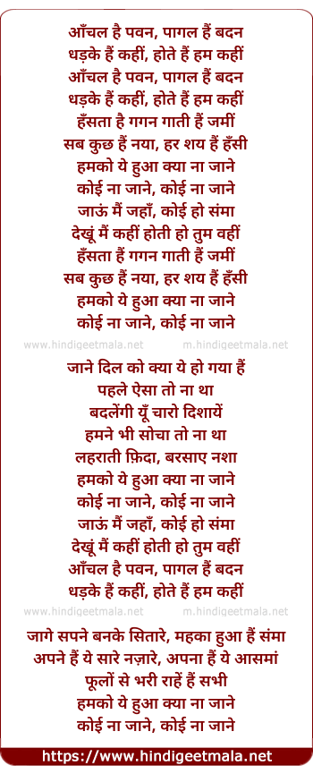 Lyrics of Aanchal Hai Pawan, Pagal Hain Badan - आँचल है पवन, पागल हैं बदन