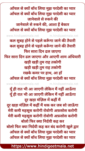 Lyrics of Aanchal Se Kyon Baandh Liyaa Mujh Paradesi Kaa Pyaar - आँचल से क्यों बाँध लिया मुझ परदेसी का प्यार