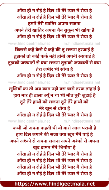 Lyrics of Aankh Hi Na Royi Hai - आँख ही ना रोई है