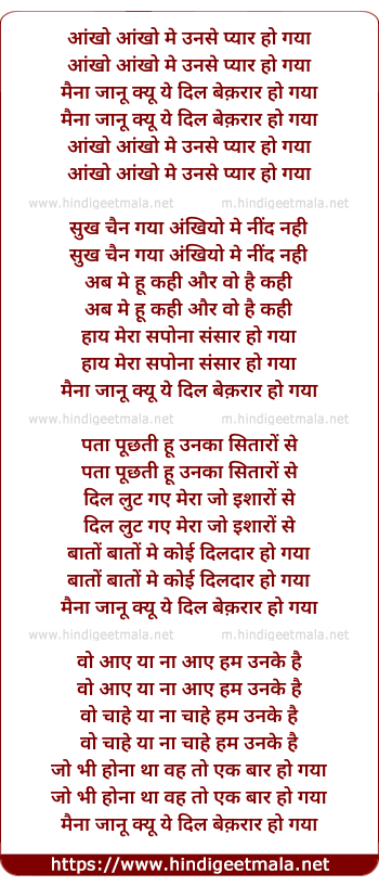 Lyrics of Aankho Aankho Me Unse Pyar Ho Gaya - आंखो आंखो में उनसे प्यार हो गया