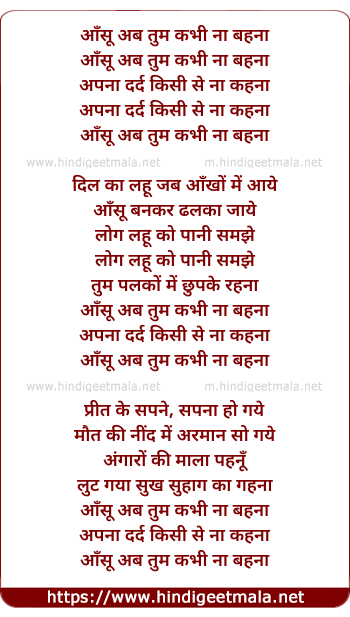 Lyrics of Aansu Abb Tum Kabhee Naa Bahana - आँसू अब तुम कभी ना बहना