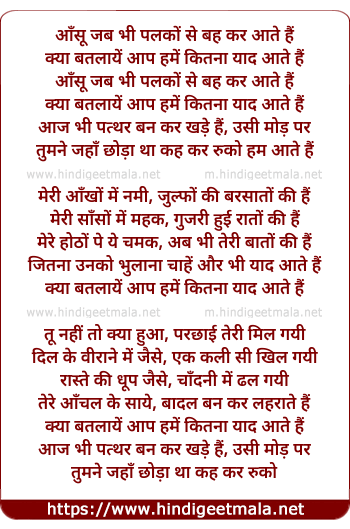Lyrics of Aansu Jab Palko Se Behkar Aate Hai - आँसू जब भी पलकों से बह कर आते हैं