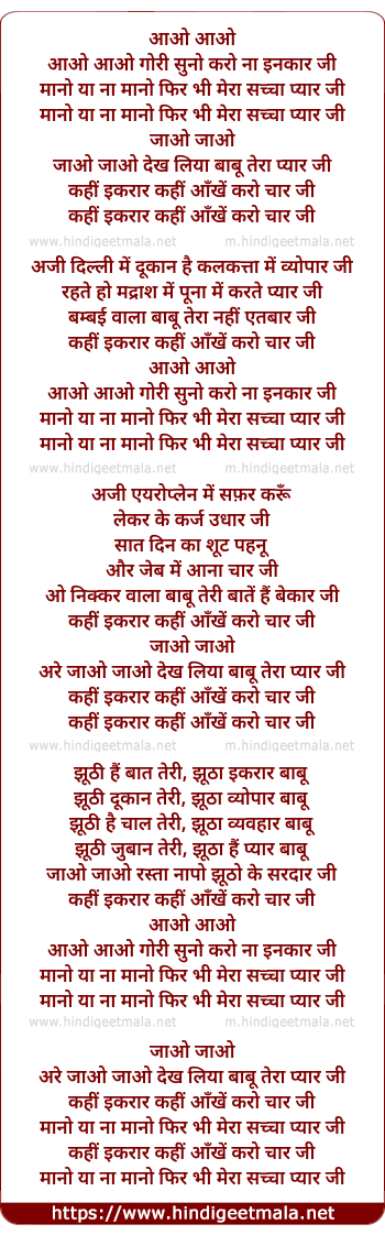Lyrics of Aao Gori Suno Karo Na Inkar Ji - आओ गोरी सुनो करो ना इनकार जी
