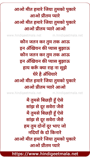 Lyrics of Aao Meet Hamare Jiya Tumko Pukare - आओ मीत हमारे जिया तुमको पुकारे