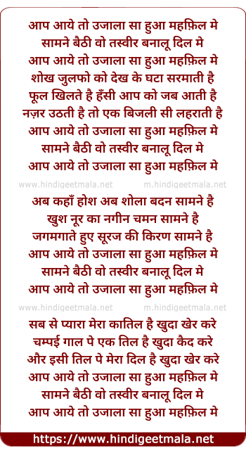 Lyrics of Aap Aaye To Ujala Sa Hua Mehfil Me - आप आये तो उजाला सा हुआ महफ़िल में