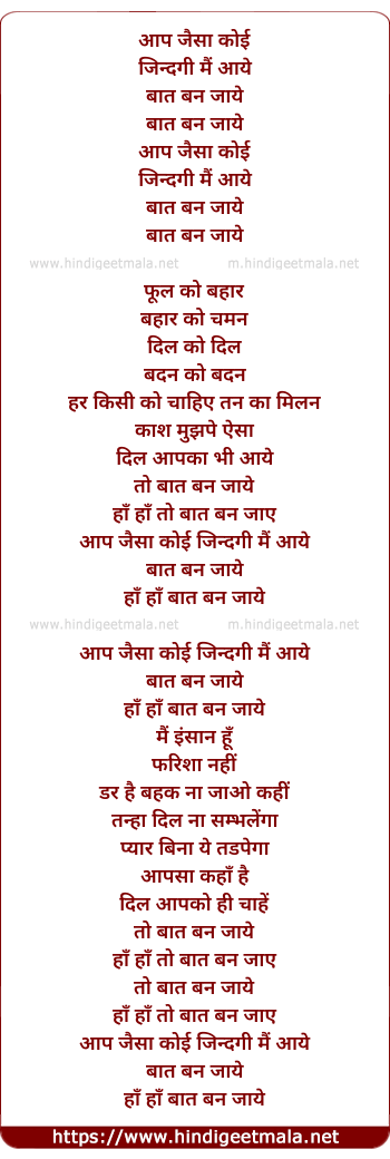 Lyrics of Aap Jaisa Koi Meri Zindagi - आप जैसा कोई मेरी जिन्दगी