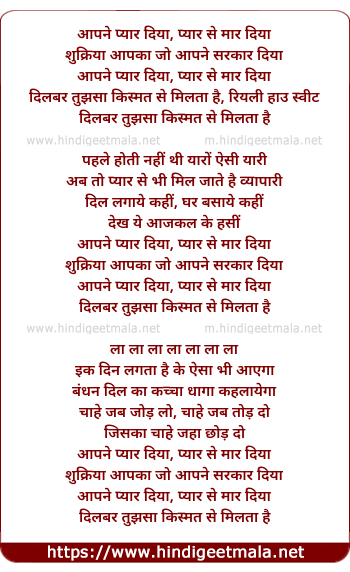 Lyrics of Aapne Pyaar Diya, Pyaar Se Maar Diya - आपने प्यार दिया, प्यार से मार दिया