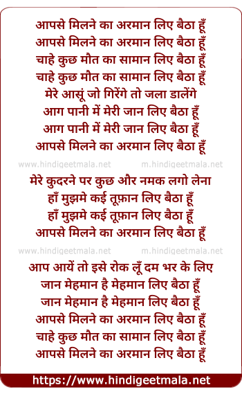 Lyrics of Aapse Milne Ka Arman Liye - आपसे मिलने का अरमान लिए