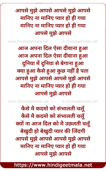 Lyrics of Aapse Mujhe Aapse Maniye Na Maniye Pyar Ho Hi Gaya - आपसे मुझे आपसे मानिये ना मानिये प्यार हो ही गया