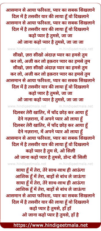 AASMAN SE AAYA FARISHTA PIYAR KA SABAQ SIKHLANE,DIL ME HE TASVEER YAR KI,LAYA HOON WOH DIKHLANE,KAHO PIYAR HE TUM SE,,,./JANA KAHO PIYAR HE TUM SE,,./SEKHO ZRA SEEKHO ANDAZ PIYAR KA HM SE TM,KRLO AJI KRLO IQRAR PIYAR KA HM SE TM,DILBAR TERI KHATIR ME CHAND CHOR KR AAYA,DENE NAZRANA ME APNE PIYAR KO LAYA HOON,SAYA HOON ME TERA,TERE SAATH SAATH HE AAOON GA,AASHIQ HOON ME TERA,BANHON SE BANDH LE JAOON GA,AASMAN SE AAYA FARISHTA PIYAR KA SABAQ SIKHLANE,DIL ME HE TASVEER YAR KI,LAYA HON WOH DIKHLANE,