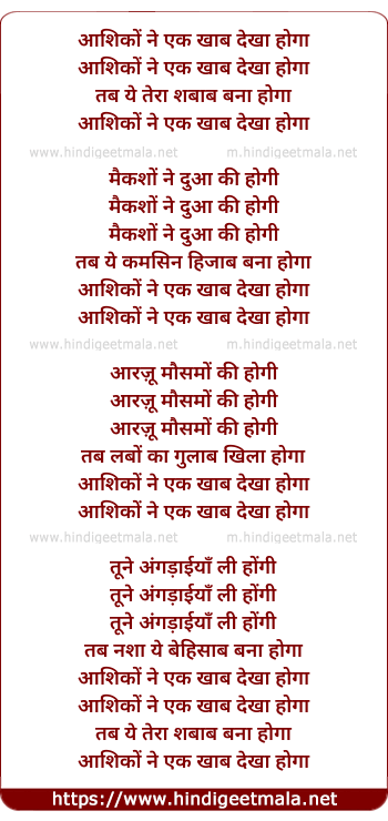 Lyrics of Aashiqo Ne Ek Khwab Dekha Hoga - आशिकों ने एक खाब देखा होगा