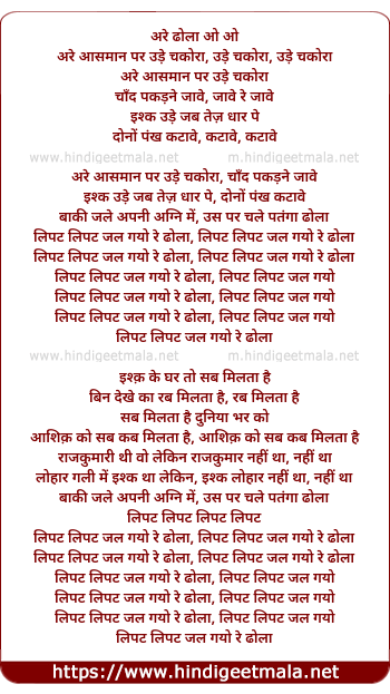 Lyrics of Aasman Par Ude Chakora - आसमान पर उड़े चकोरा