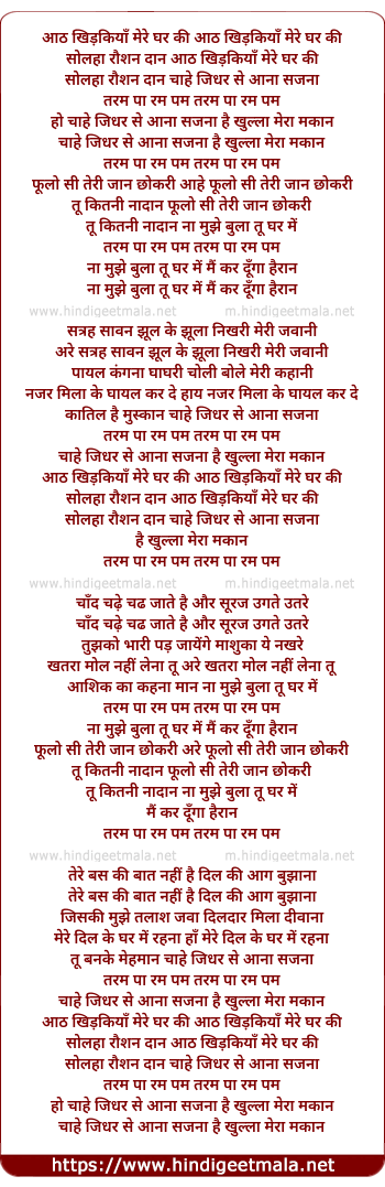 Lyrics of Aath Khidkiya Mere Ghar Ki - आठ खिड़कियाँ मेरे घर की