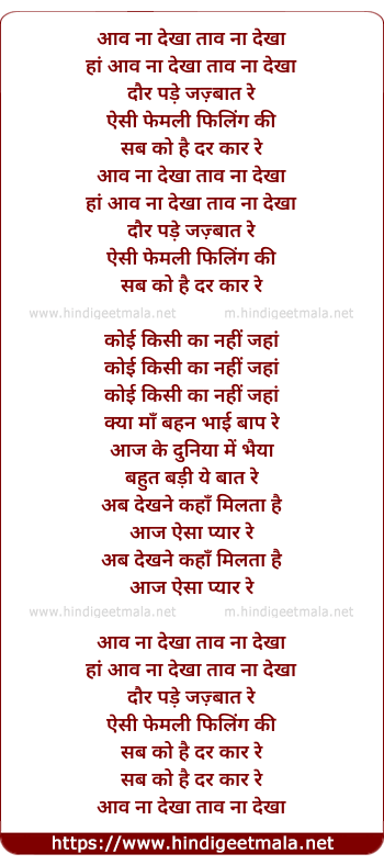 Lyrics of Aav Na Dekha Taav Na Dekha - आव ना देखा ताव ना देखा
