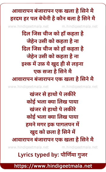 Lyrics of Aawarapan Banjarapan - आवारापन बंजारापन