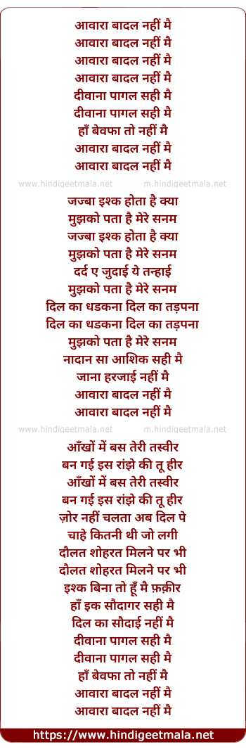 Lyrics of Aawara Baadal Nahi Main - आवारा बादल नहीं मै