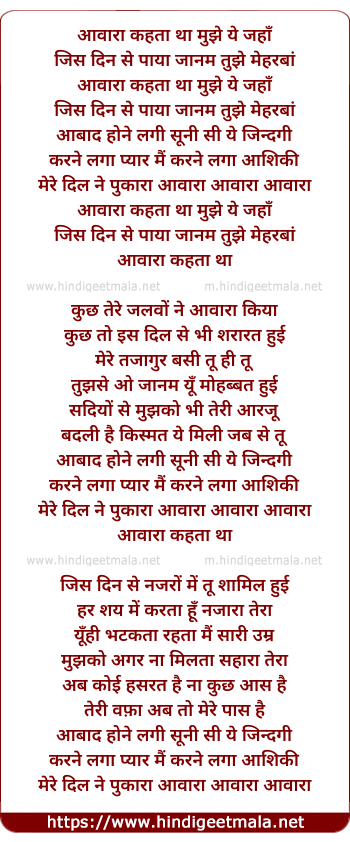 Lyrics of Aawaraa Aawaraa - आवारा कहता था मुझे ये जहाँ