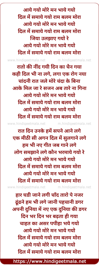 Lyrics of Aaye Gayo More Man Bhaye Gayo Dil Me Samaye Gayo - आये गयो मोरे मन भाये गयो दिल में समाये गयो