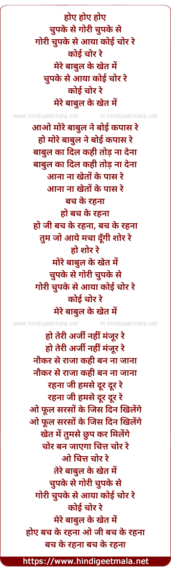 Lyrics of Aaye Gori Chupke Se - आये गोरी चुपके से