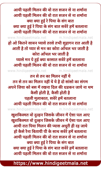 Lyrics of Aayi Pehle Milan Ki Wo Raat, Sajan Se Na Sharmana - आयी पहली मिलन की वो रात, सजन से ना शर्माना