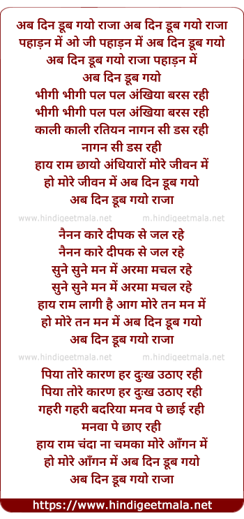 Lyrics of Ab Din Doob Gayo Raja Pahadan Me - अब दिन डूब गयो राजा पहाड़न में