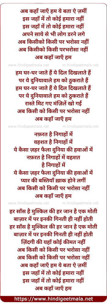 Lyrics of Ab Kaha Jaye Hum, Ye Bata Aye Zameen - अब कहाँ जाएँ हम ये बता ऐ ज़मीं