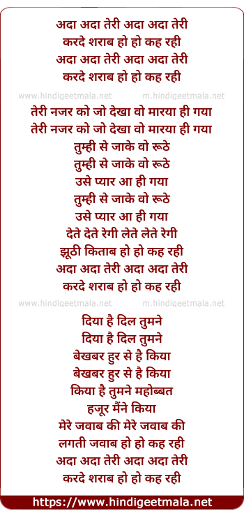 Lyrics of Ada Ada Teri Maste Sharab - अदा अदा तेरी अदा अदा तेरी