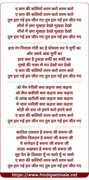 Lyrics of Ae Baag Ki Kaliyo Sharm Karo - ऐ बाग़ की कलियों शर्म करो