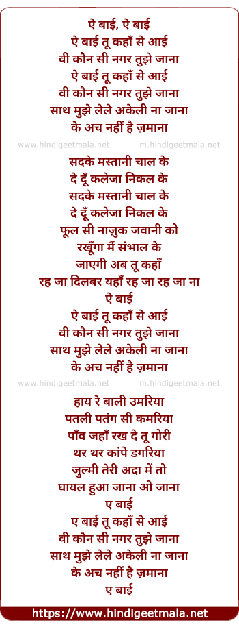 Lyrics of Ae Baai Tu Kaha Se Aayi Wo Kaun Se Nagar Tujhe Jana - ऐ बाई तू कहाँ से आई वो कौन सी नगर तुझे जाना