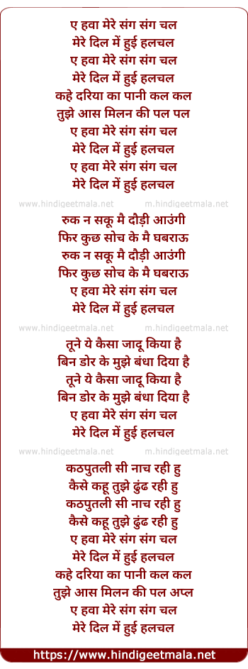 Lyrics of Ae Hawa Mere Sang Sang Chal, Mere Dil Me Hui Hal Chal - ए हवा मेरे संग संग चल, मेरे दिल में हुई हलचल