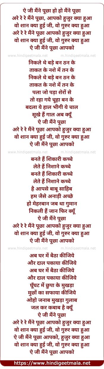 Lyrics of Ae Ji Maine Poochha Apko Huzur Kya Hua (Asha) - ऐ जी मैंने पूछा हो हो मैंने पूछा