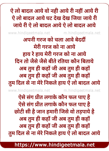 Lyrics of Ae Lo Baadal Aaye Wo Nahi Aaye Ree - ऐ लो बादल आये वो नही आये री
