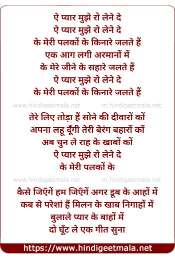 Lyrics of Ae Pyar Mujhe Ro Lene De, Ke Meri Palko Ke Kinare Jalte Hai - ऐ प्यार मुझे रो लेने दे, के मेरी पलकों के किनारे जलते हैं