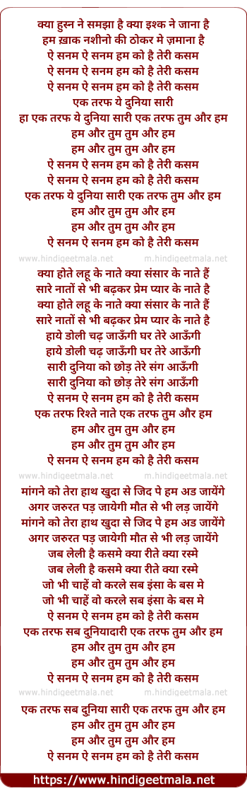 Lyrics of Ae Sanam Ae Sanam Hum Ko Hai Teri Kasam - ऐ सनम ऐ सनम हम को है तेरी कसम