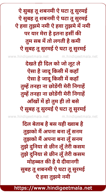 Lyrics of Ae Subah Tu Shabnami Ae Ghata Tu Surmai - ऐ सुबह तू शबनमी ऐ घटा तू सुरमई