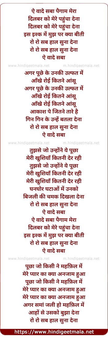 Lyrics of Ae Wade Saba Paigam Mera - ऐ वादे सबा पैगाम मेरा