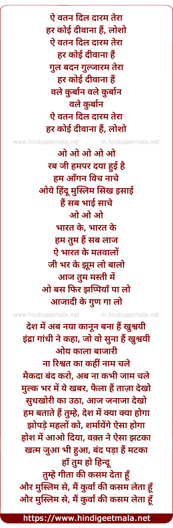 Lyrics of Ae Watan Dil Daram Tera - ऐ वतन दिल दारम तेरा