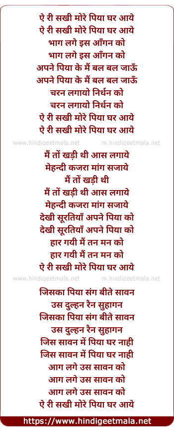 Lyrics of Aerii Sakhi Morae - ऐ री सखी मोरे पिया घर आये