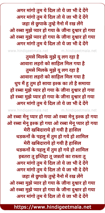Lyrics of Agar Maangon Tum Ye Dil - अगर मांगो तुम ये दिल