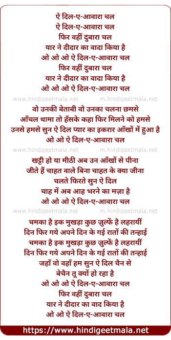 Lyrics of Ai Dile Aavaaraa Chal - ऐ दिल-ए-आवारा चल