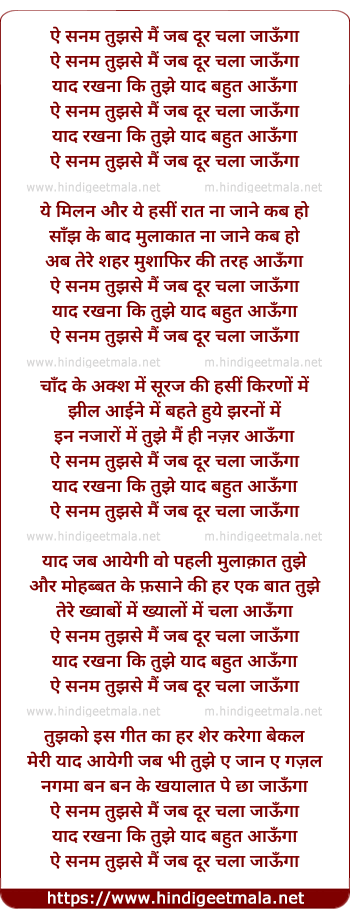 Lyrics of Ai Sanam Tujh Se Main Jab Dur Chalaa Jaaungaa - ऐ सनम तुझसे मैं जब दूर चला जाऊँगा