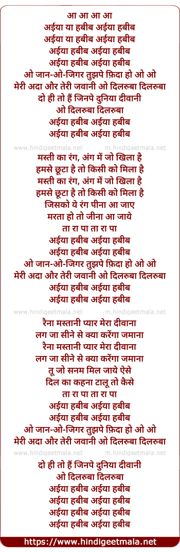 Lyrics of Aiya Ya Habib, O Jaan-O-Jigar - अईया या हबीब, ओ जान-ओ-जिगर
